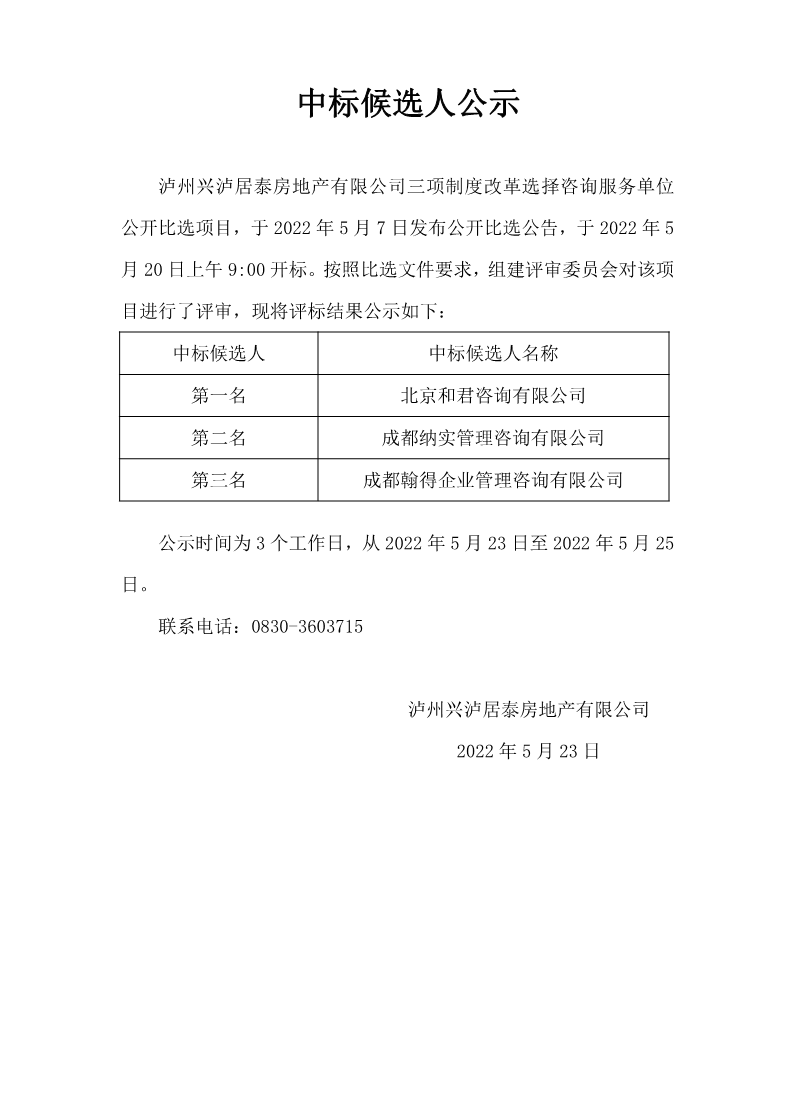 瀘州興瀘居泰房地產(chǎn)有限公司三項制度改革選擇咨詢服務(wù)單位公開比選項目中標(biāo)候選人公示 作者: 來源: 日期:2022-05-23 瀏覽次數(shù): 次 【字體:小 大】 【打印正文】