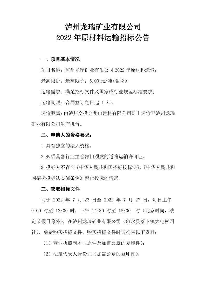 瀘州龍瑞礦業(yè)有限公司原材料運(yùn)輸招標(biāo)公告
