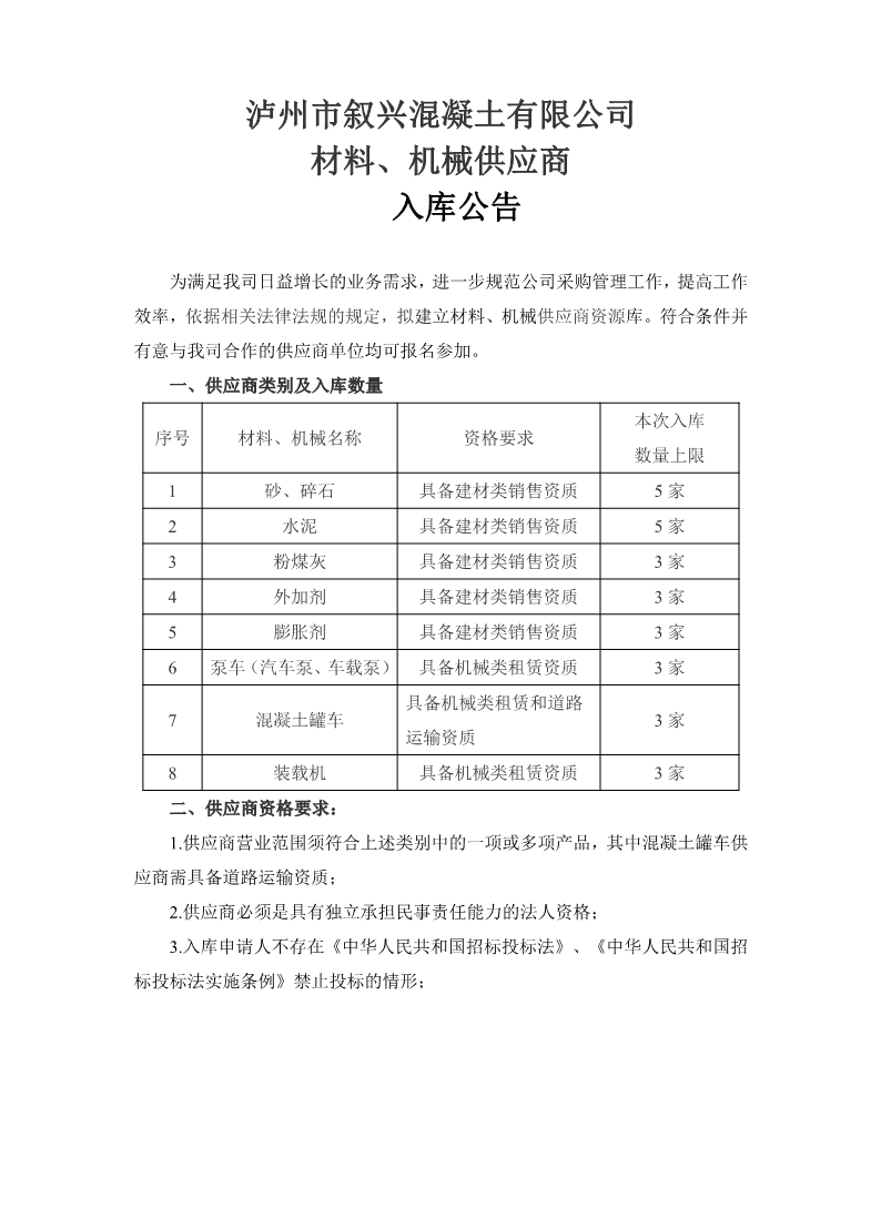 瀘州市敘興混凝土有限公司材料、機(jī)械供應(yīng)商入庫公告