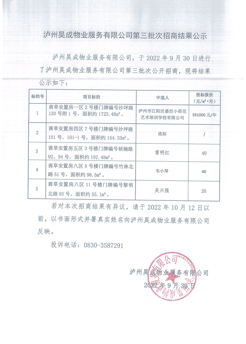 瀘州昊成物業(yè)服務(wù)有限公司第三批次招商結(jié)果公示