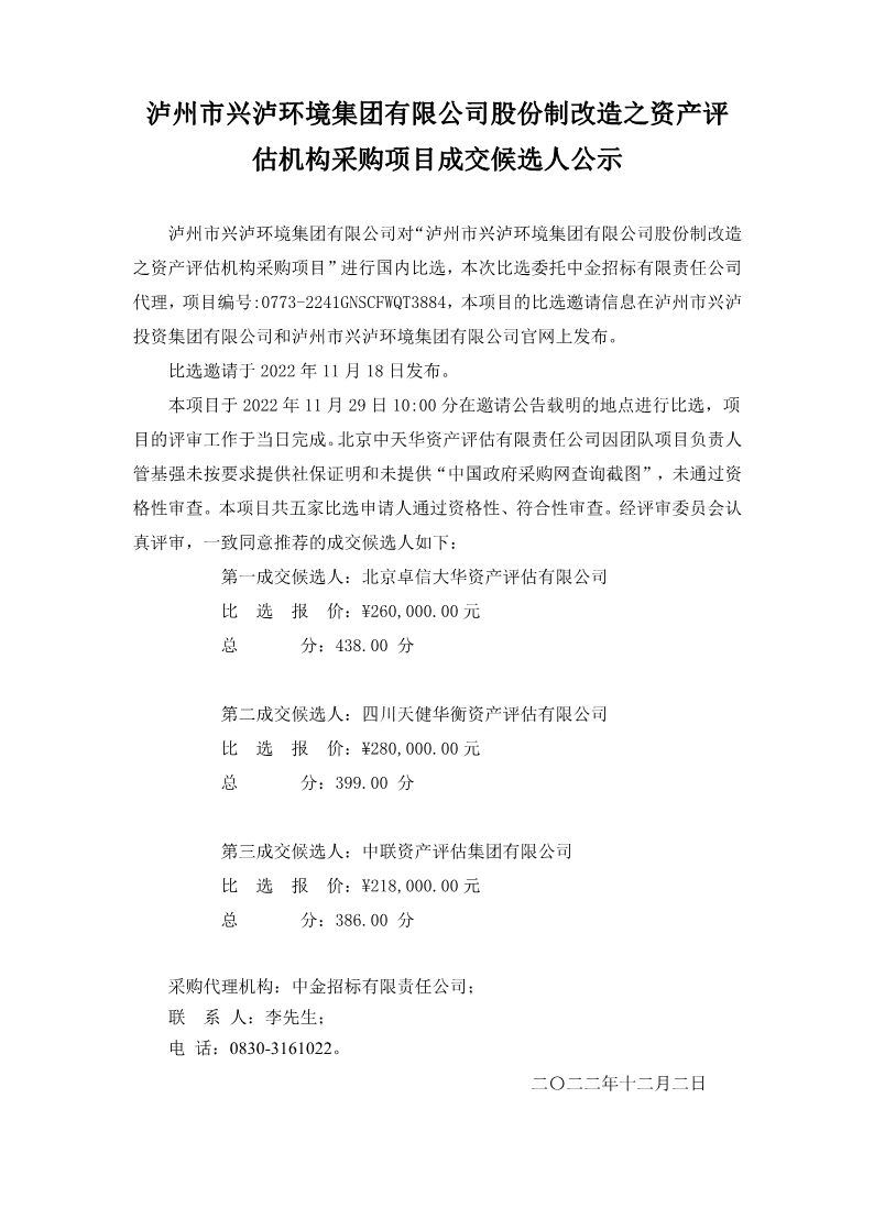瀘州市興瀘環(huán)境集團有限公司股份制改造之資產(chǎn)評估機構(gòu)采購項目成交候選人公示 作者: 來源: 日期:2022-12-02 瀏覽次數(shù): 次 【字體:小 大】 【打印正文】