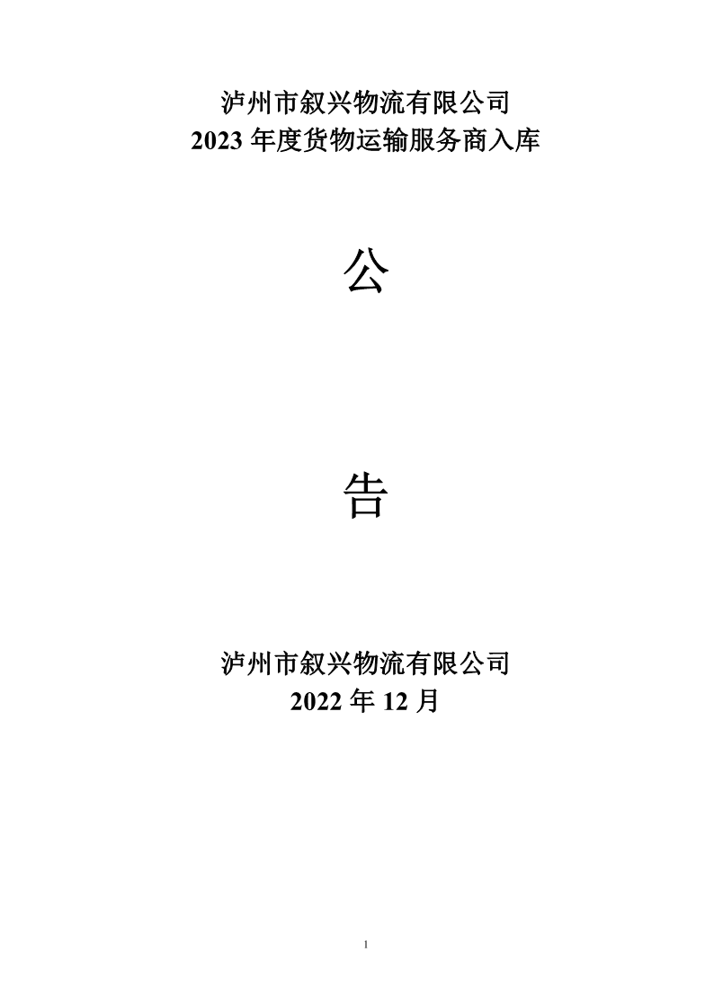 瀘州市敘興物流有限公司2023年度貨物運輸服務(wù)商入庫