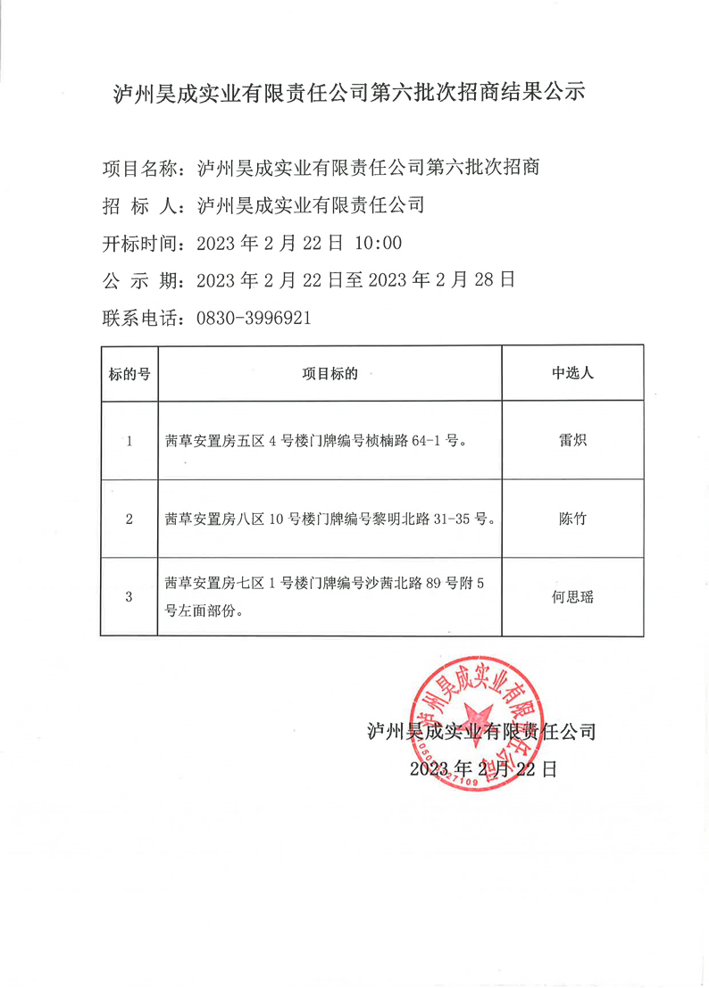 瀘州昊成實(shí)業(yè)有限責(zé)任公司第六批次招商結(jié)果公示