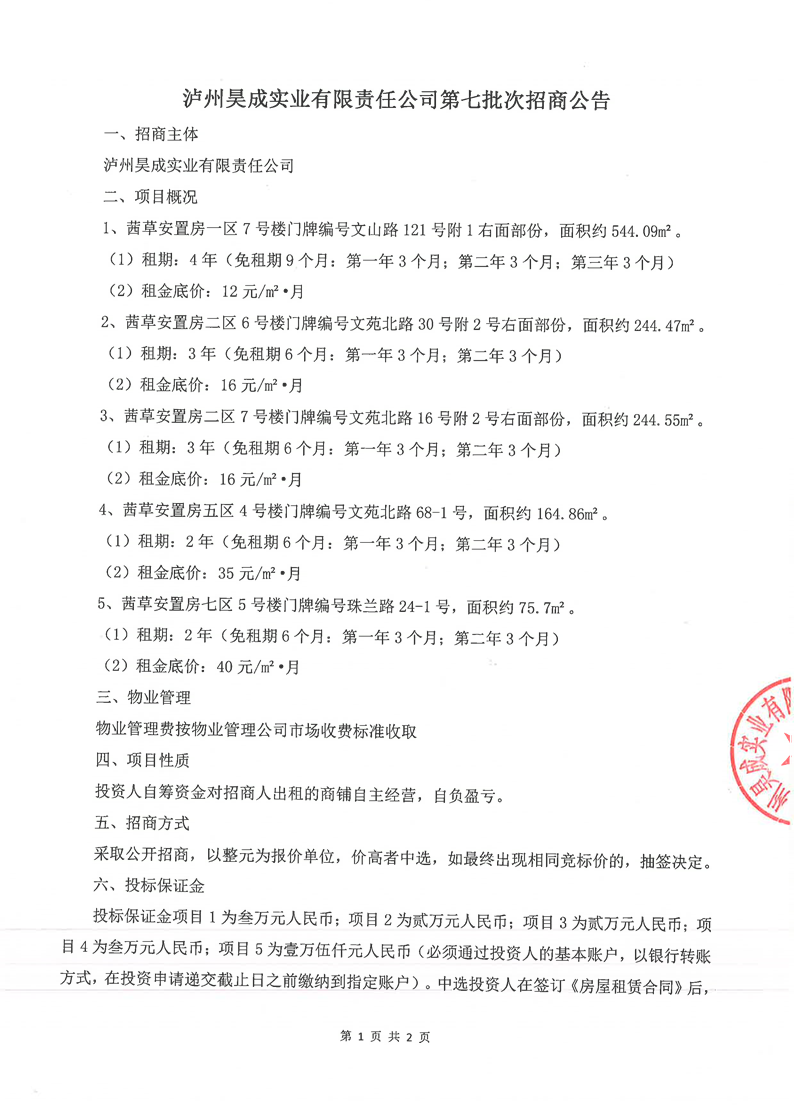 瀘州昊成實業(yè)有限責任公司第七批次招商公告