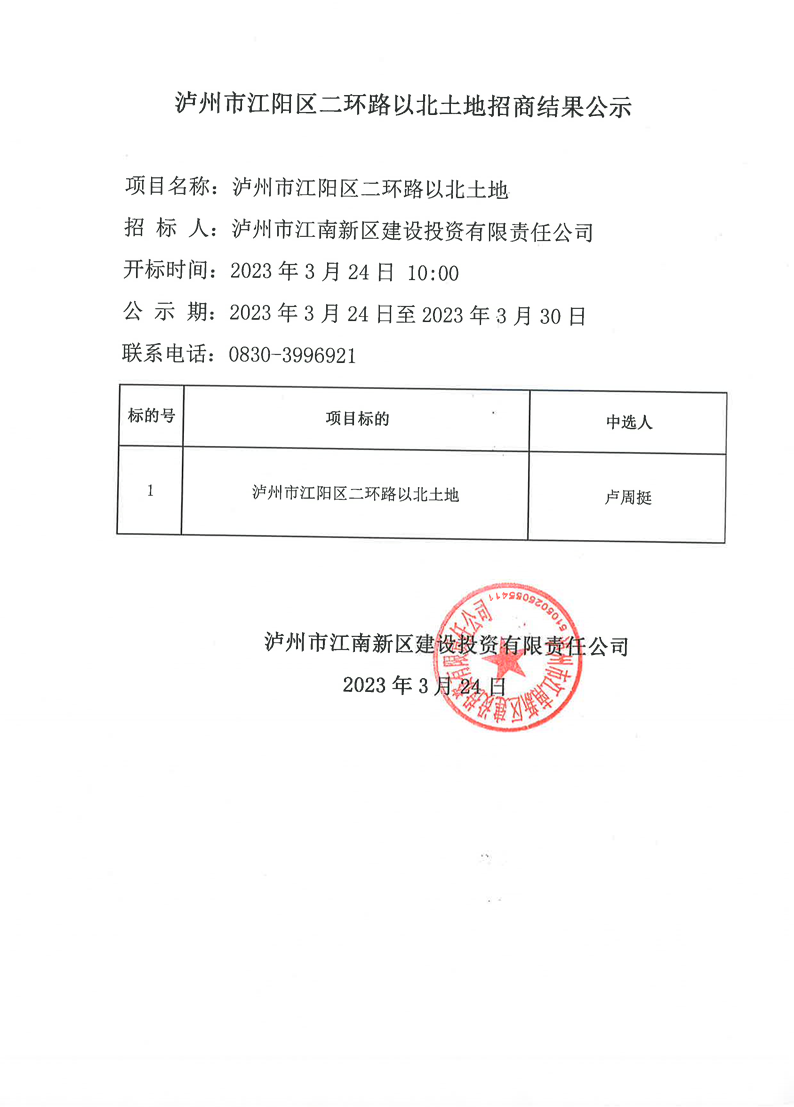 瀘州市江陽區(qū)二環(huán)路以北土地招商結果公示