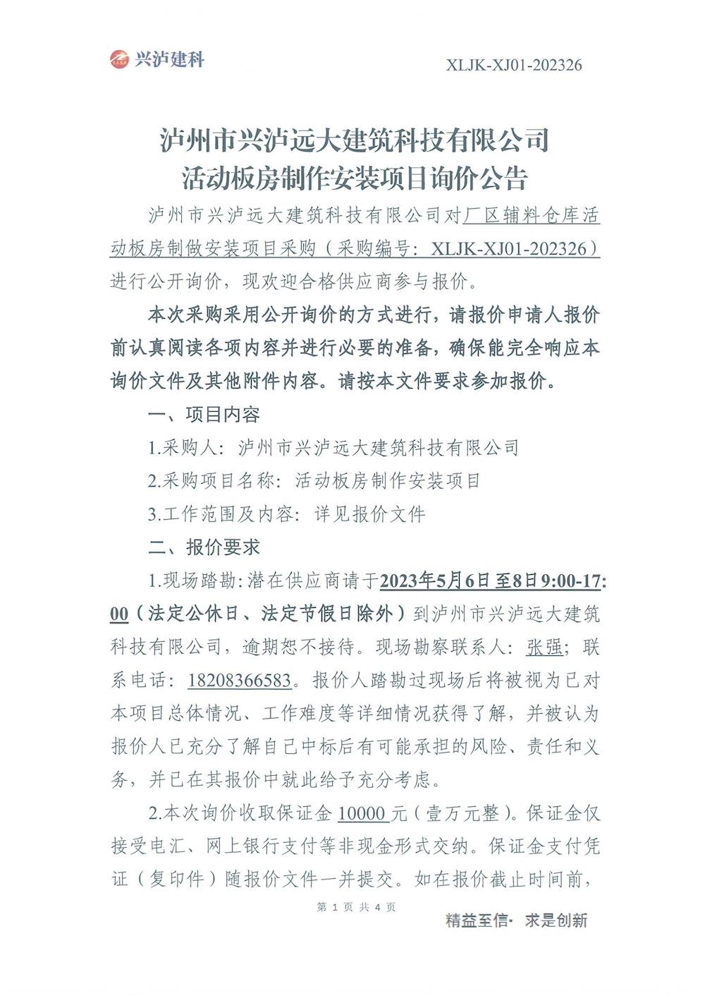 瀘州市興瀘遠(yuǎn)大建筑科技有限公司活動板房制作安裝項目詢價公告