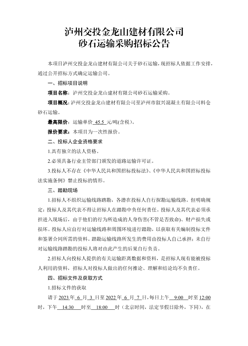 瀘州交投金龍山建材有限公司 砂石運輸采購招標(biāo)公告