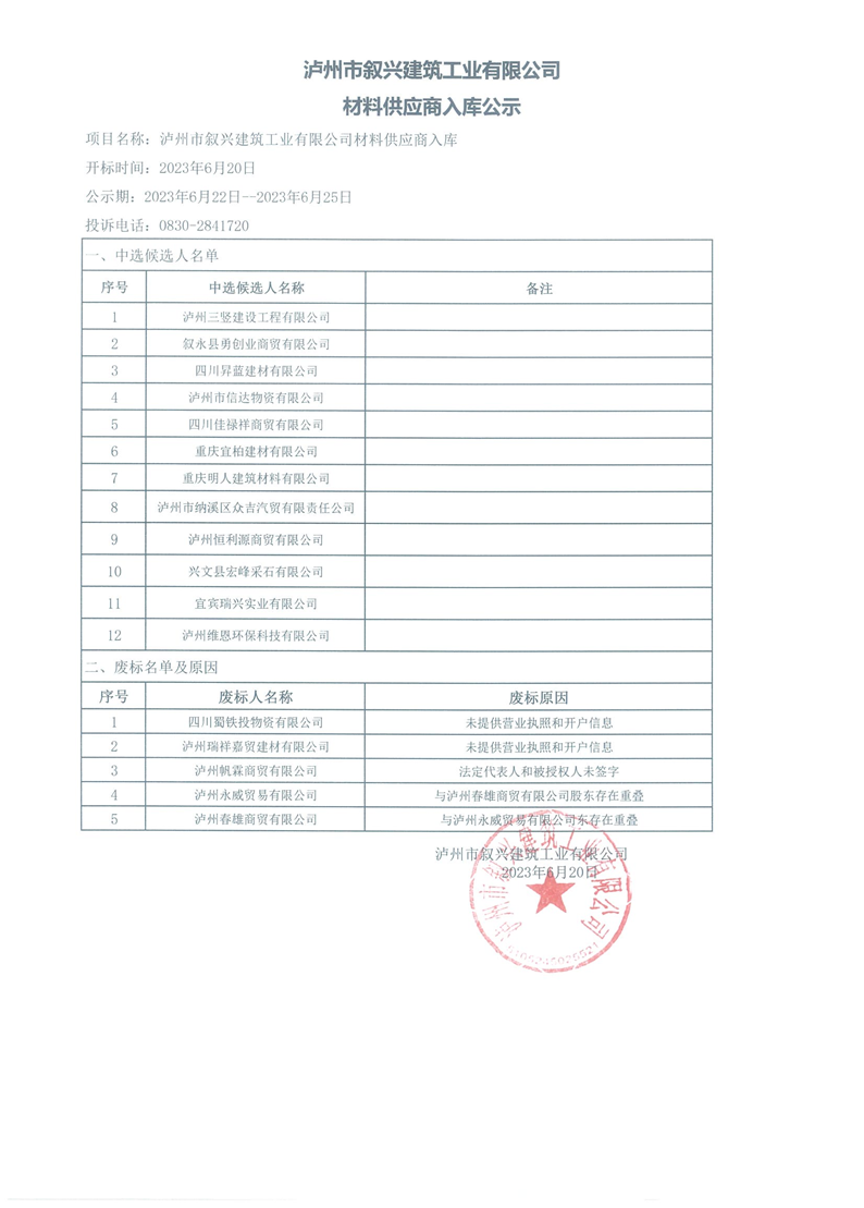 瀘州市敘興建筑工業(yè)有限公司材料供應(yīng)商入庫公示
