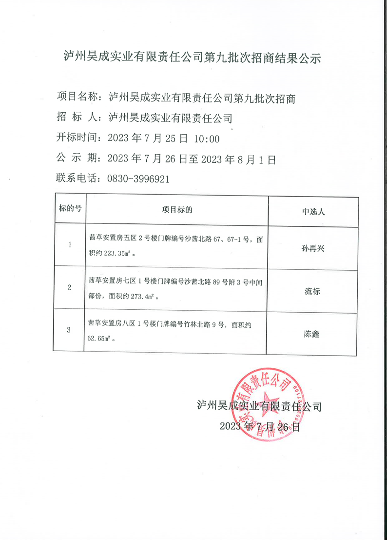 瀘州昊成實業(yè)有限責(zé)任公司第九批次招商結(jié)果公示