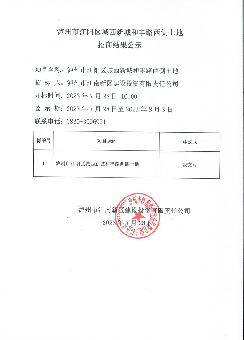 瀘州市江陽區(qū)城西新城和豐路西側(cè)土地招商結(jié)果公示