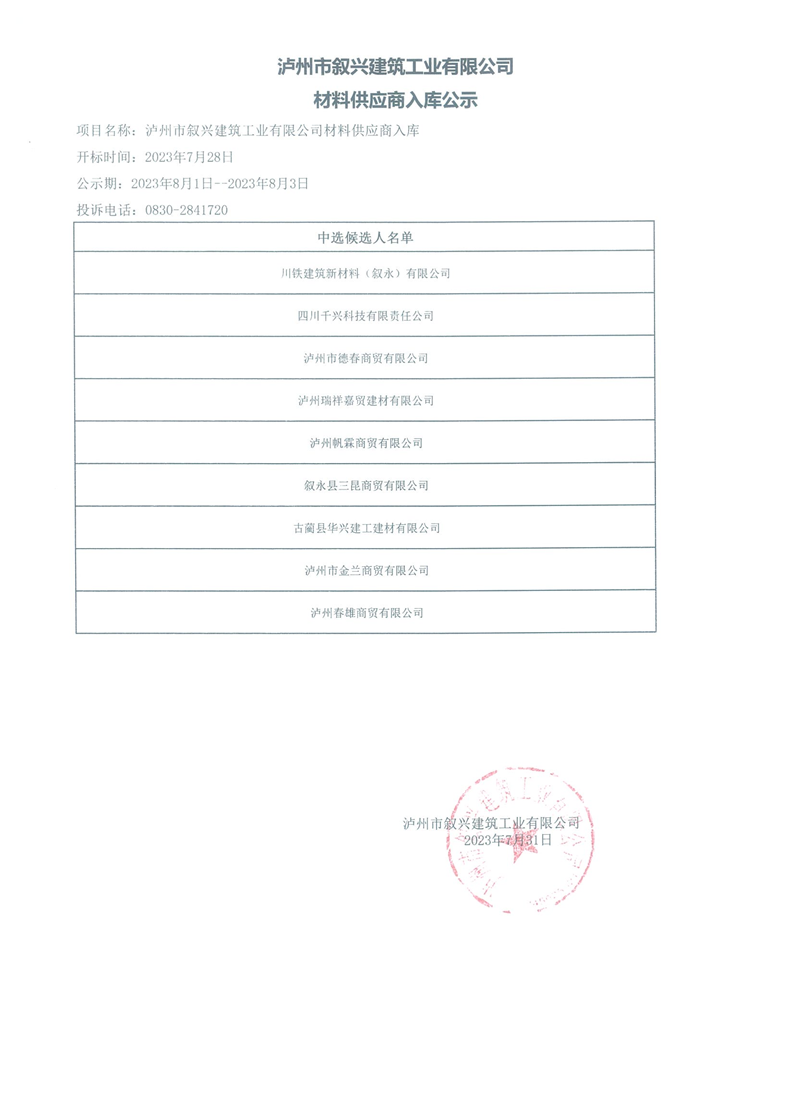 瀘州市敘興建筑有限公司材料供應(yīng)商入庫公示