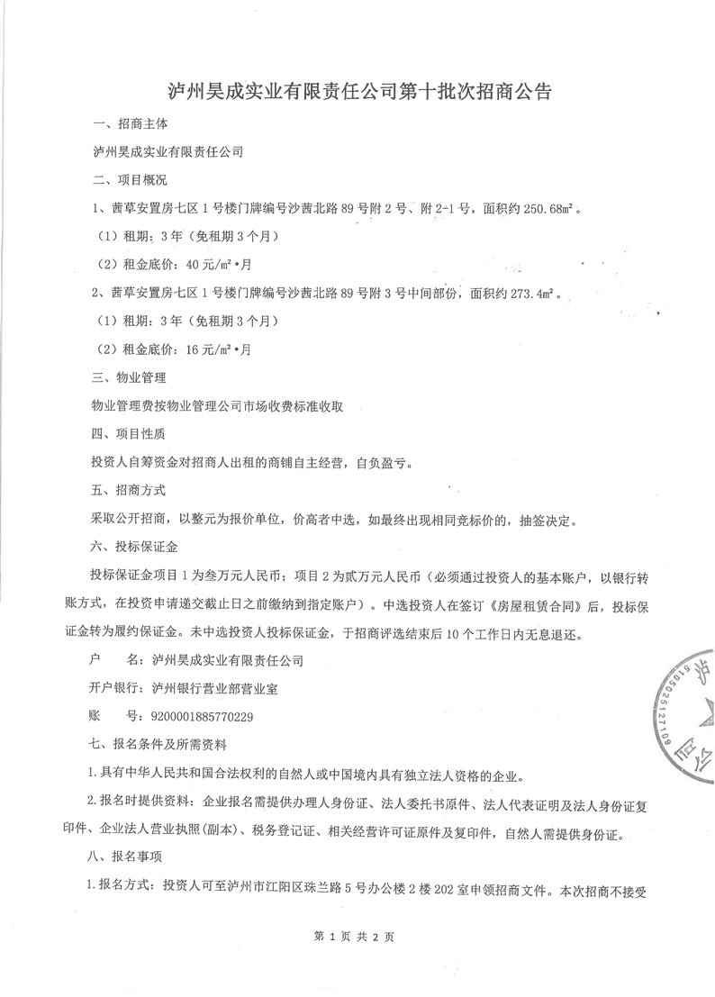 瀘州昊成實(shí)業(yè)有限責(zé)任公司第十批次招商公告