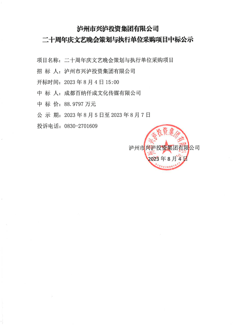 瀘州市興瀘投資集團有限公司二十周年慶文藝晚會策劃與執(zhí)行單位采購項目中標(biāo)公示