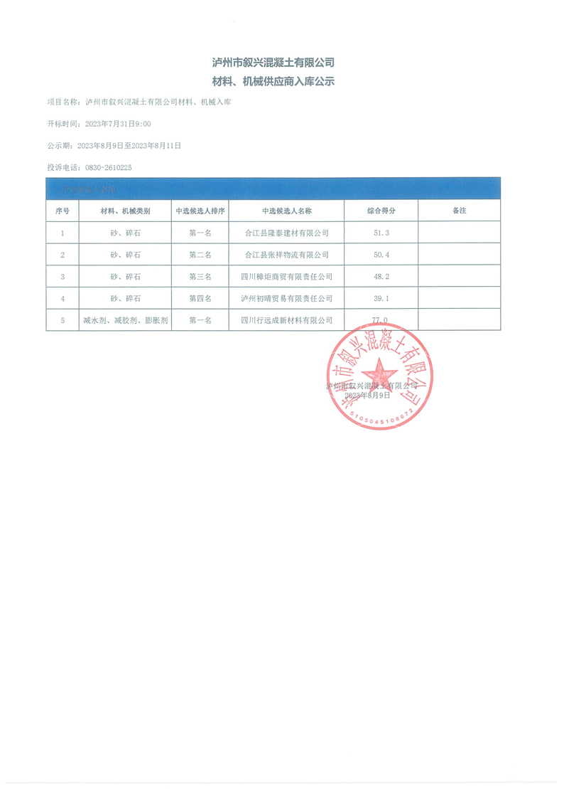 瀘州市敘興混凝土有限公司材料、機(jī)械供應(yīng)商入庫(kù)公示