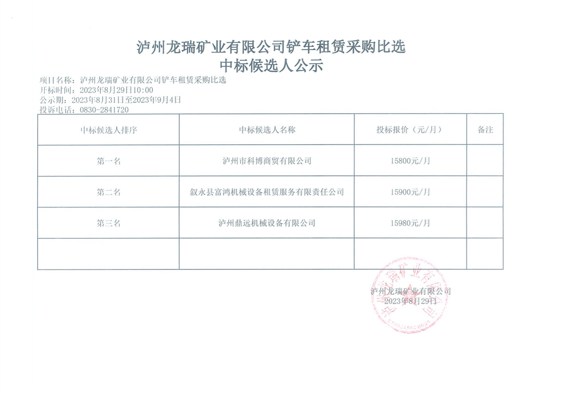 瀘州龍瑞礦業(yè)有限公司鏟車租賃采購比選中標(biāo)候選人公示