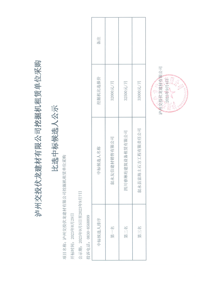 瀘州交投伏龍建材有限公司挖掘機(jī)租賃采購(gòu)比選中標(biāo)候選人公示