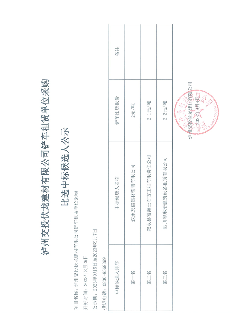 瀘州交投伏龍建材有限公司鏟車租賃采購比選中標候選人公示