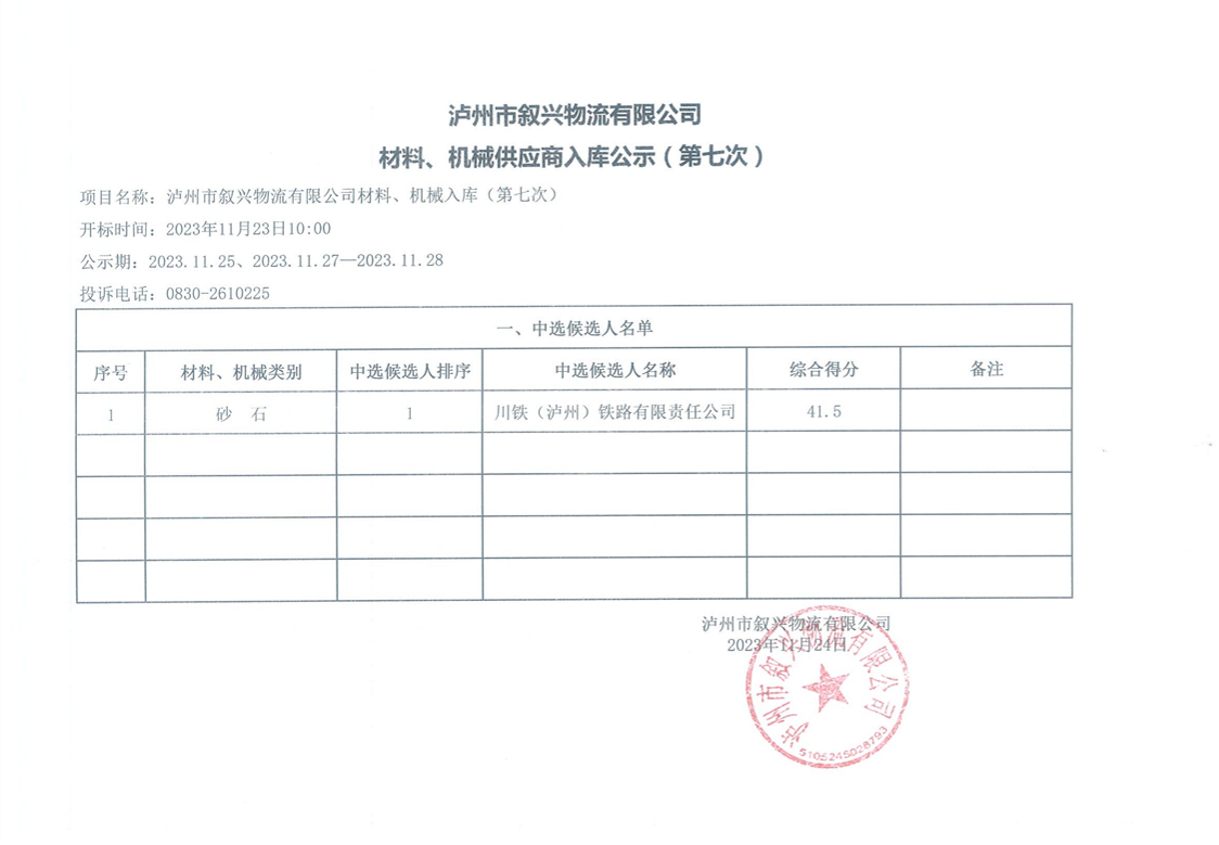 瀘州市敘興物流有限公司材料、機械供應(yīng)商入庫公示(第七次)
