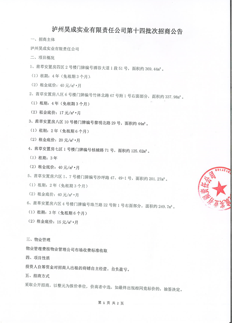 瀘州昊成實(shí)業(yè)有限責(zé)任公司第十四批次招商公告