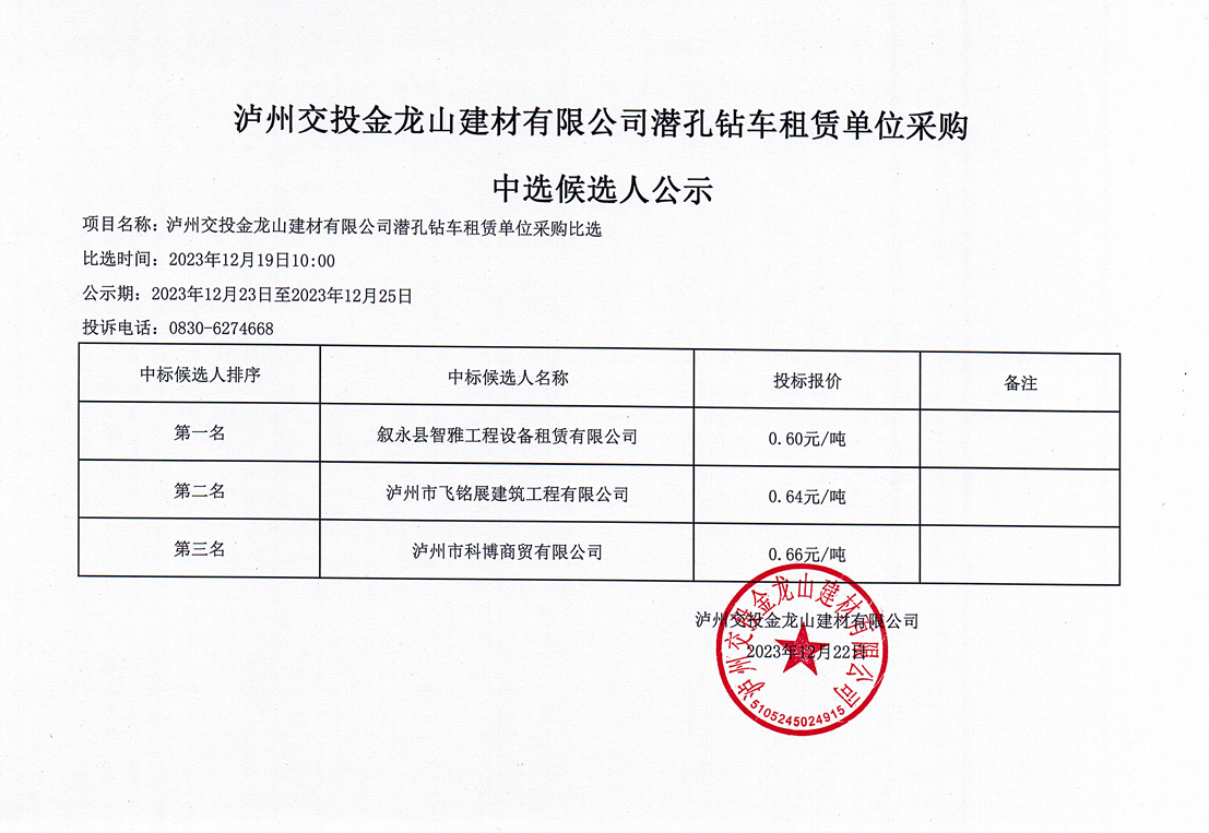 瀘州交投金龍山建材有限公司潛孔鉆車租賃單位采購中選候選人公示