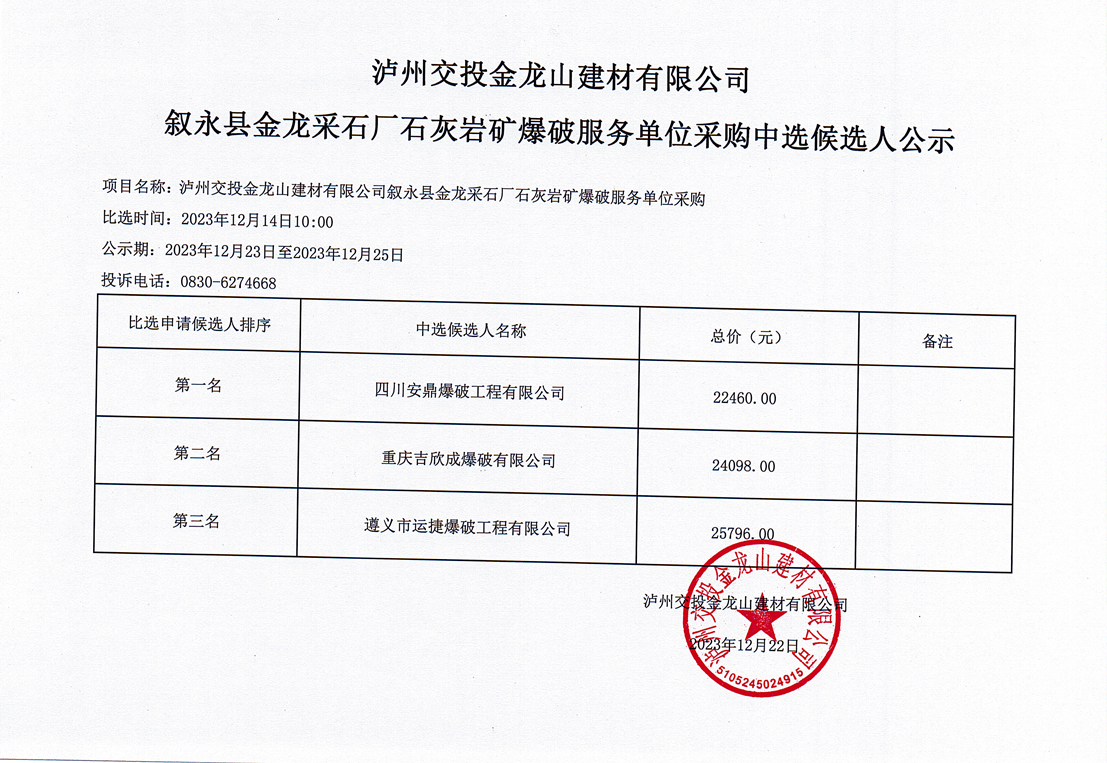 瀘州交投金龍山建材有限公司敘永縣金龍采石廠石灰?guī)r礦爆破服務(wù)單位采購中選候選人公示