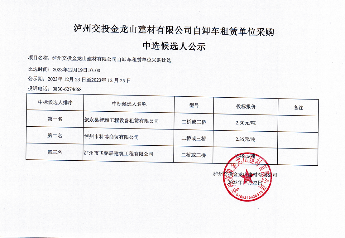 瀘州交投金龍山建材有限公司自卸車租賃單位采購(gòu)中選候選人公示