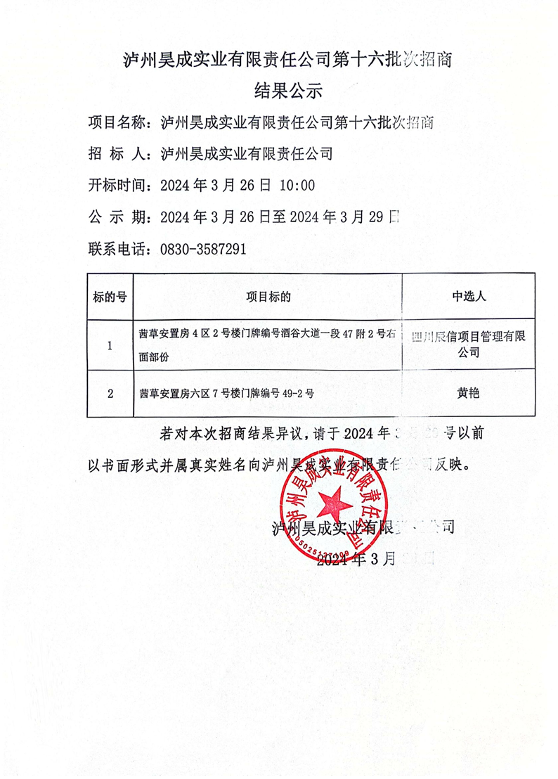 瀘州昊成實業(yè)有限責任公司第十六批次招商結(jié)果公示