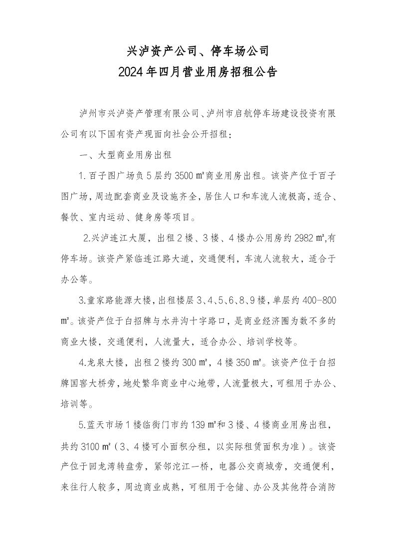興瀘資產公司、停車場公司2024年四月營業(yè)用房招租公告