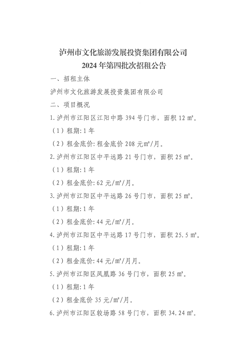 瀘州市文化旅游發(fā)展投資集團(tuán)有限公司2024年第四批次招租公告