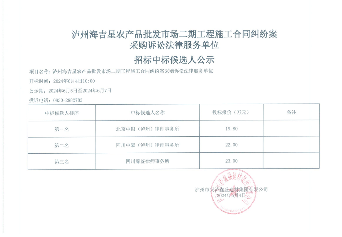 瀘州海吉星農(nóng)產(chǎn)品批發(fā)市場(chǎng)二期工程施工合同糾紛案采購(gòu)訴訟法律服務(wù)單位招標(biāo)中標(biāo)候選人公示 作者: 來(lái)源: 日期:2024-06-04 瀏覽次數(shù): 次 【字體:小 大】 【打印正文】