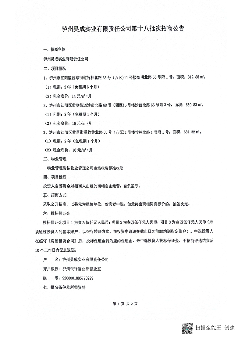 瀘州昊成實(shí)業(yè)有限責(zé)任公司第十八批次招商公告