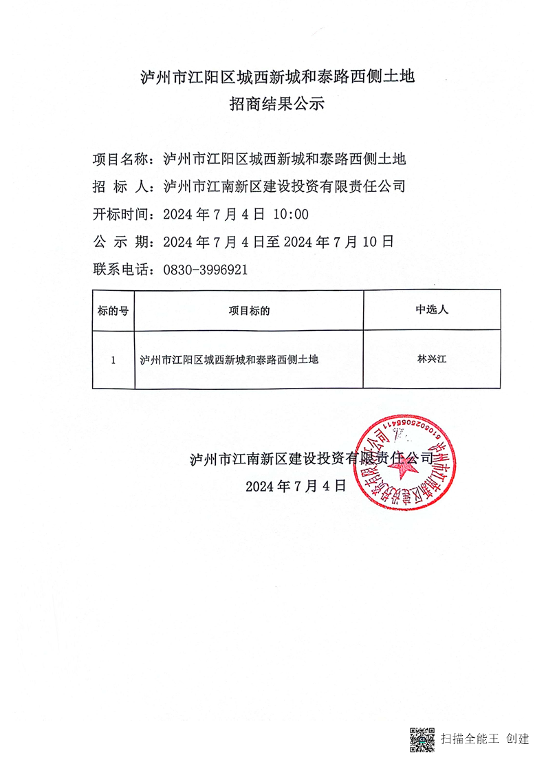 瀘州市江陽區(qū)城西新城和泰路西側(cè)土地招商結(jié)果公示