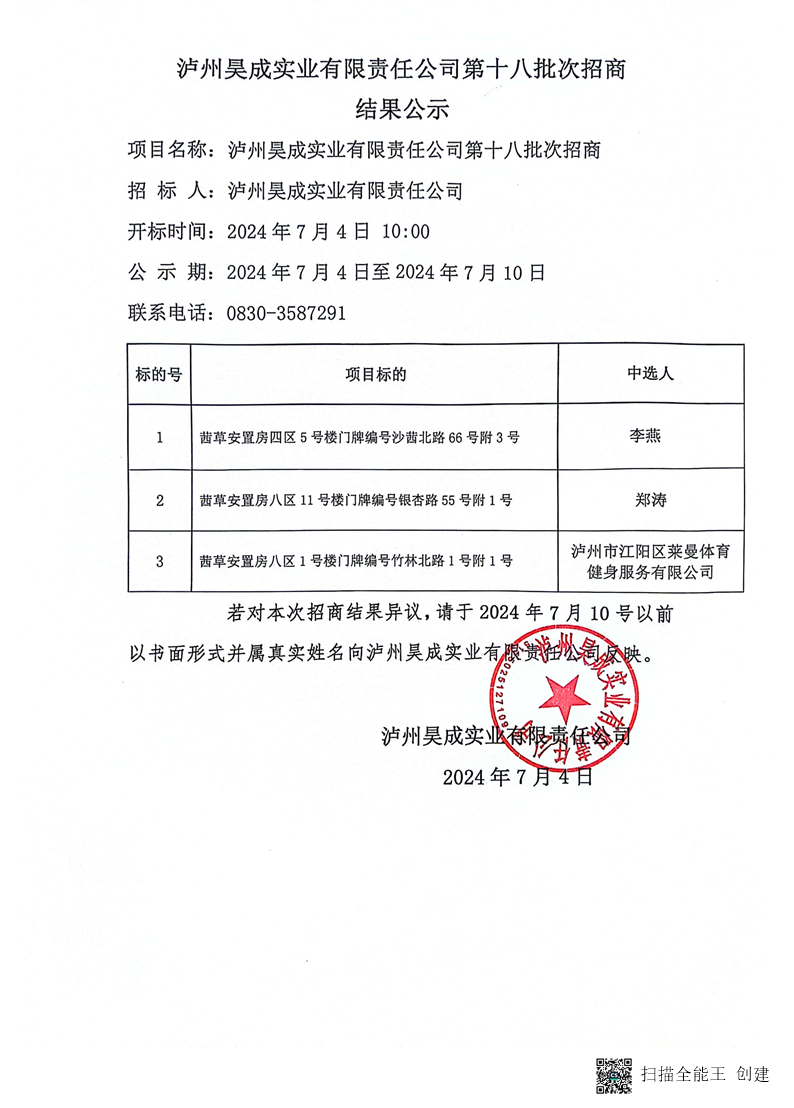 瀘州昊成實(shí)業(yè)有限責(zé)任公司第十八批次招商結(jié)果公示