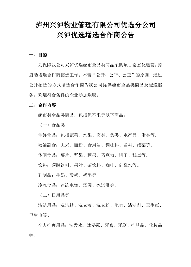 瀘州興瀘物業(yè)管理有限公司優(yōu)選分公司興瀘優(yōu)選增選合作商公告