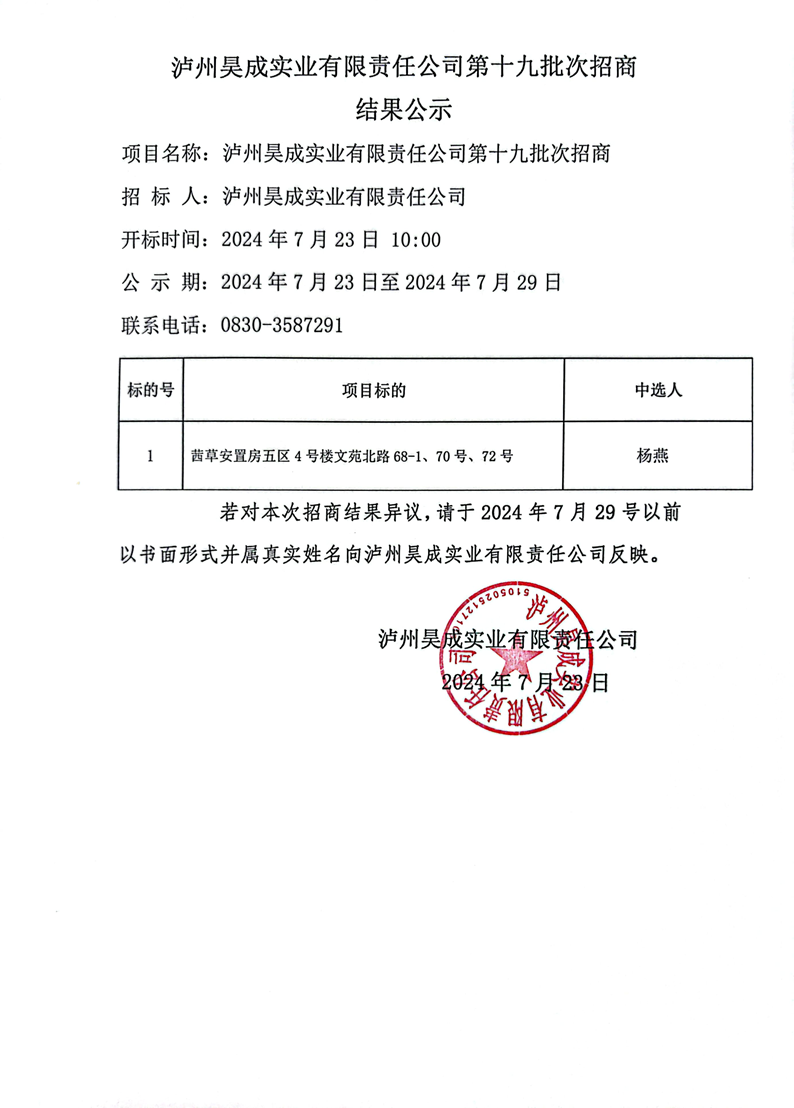 瀘州昊成實(shí)業(yè)有限責(zé)任公司第十九批次招商結(jié)果公示