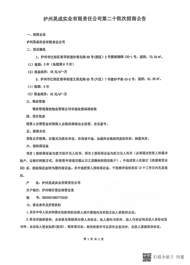 瀘州昊成實(shí)業(yè)有限責(zé)任公司第二十批次招商公告
