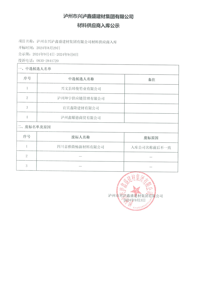 瀘州市興瀘鑫盛建材集團有限公司材料供應(yīng)商入庫公示