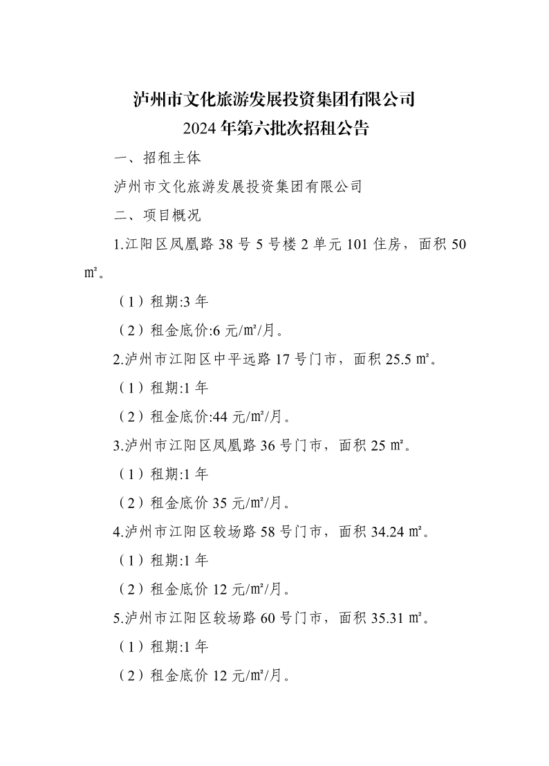 瀘州市文化旅游發(fā)展投資集團有限公司2024年第六批次招租公告