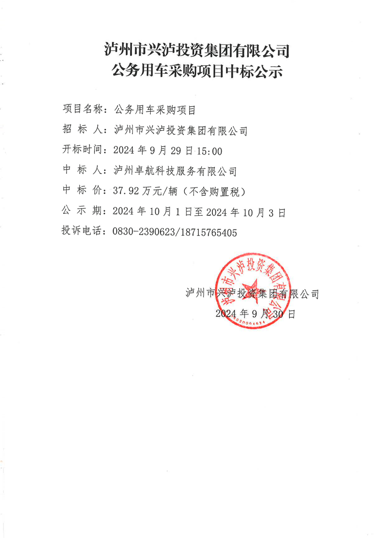 瀘州市興瀘投資集團(tuán)有限公司公務(wù)用車采購(gòu)項(xiàng)目中標(biāo)公示 作者: 來(lái)源: 日期:2024-09-30 瀏覽次數(shù): 次 【字體:小 大】 【打印正文】