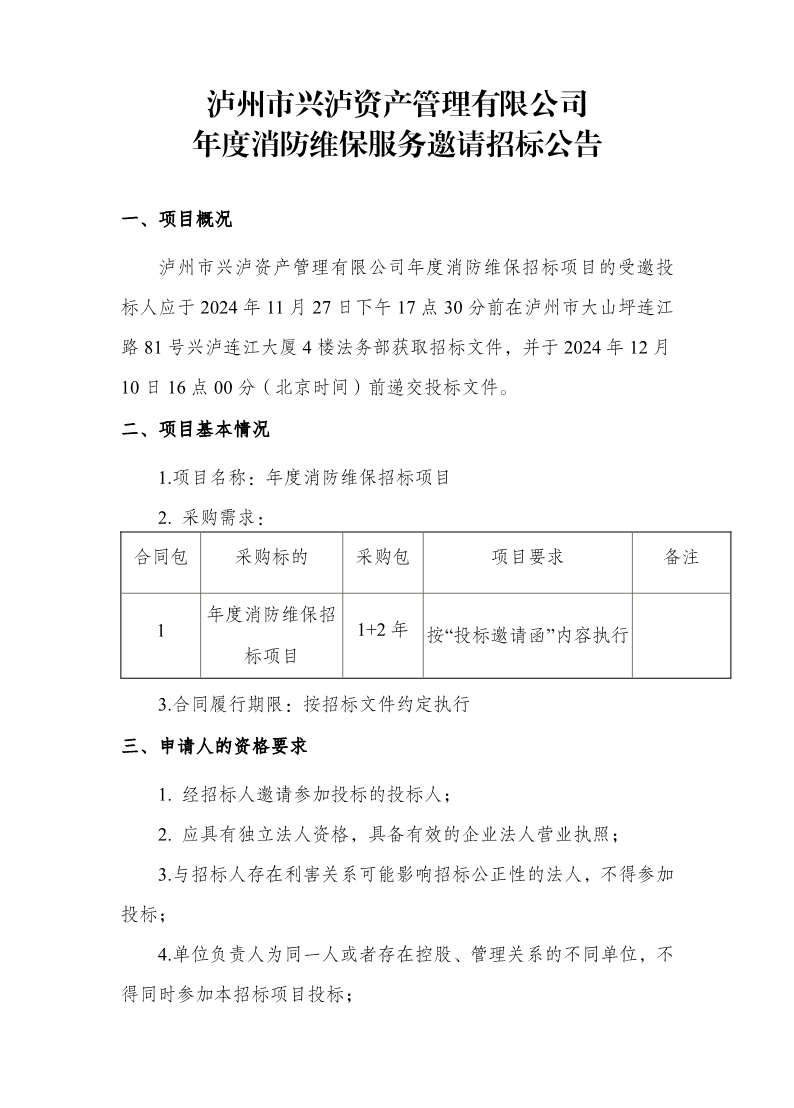 瀘州市興瀘資產(chǎn)管理有限公司年度消防維保服務(wù)邀請招標(biāo)公告