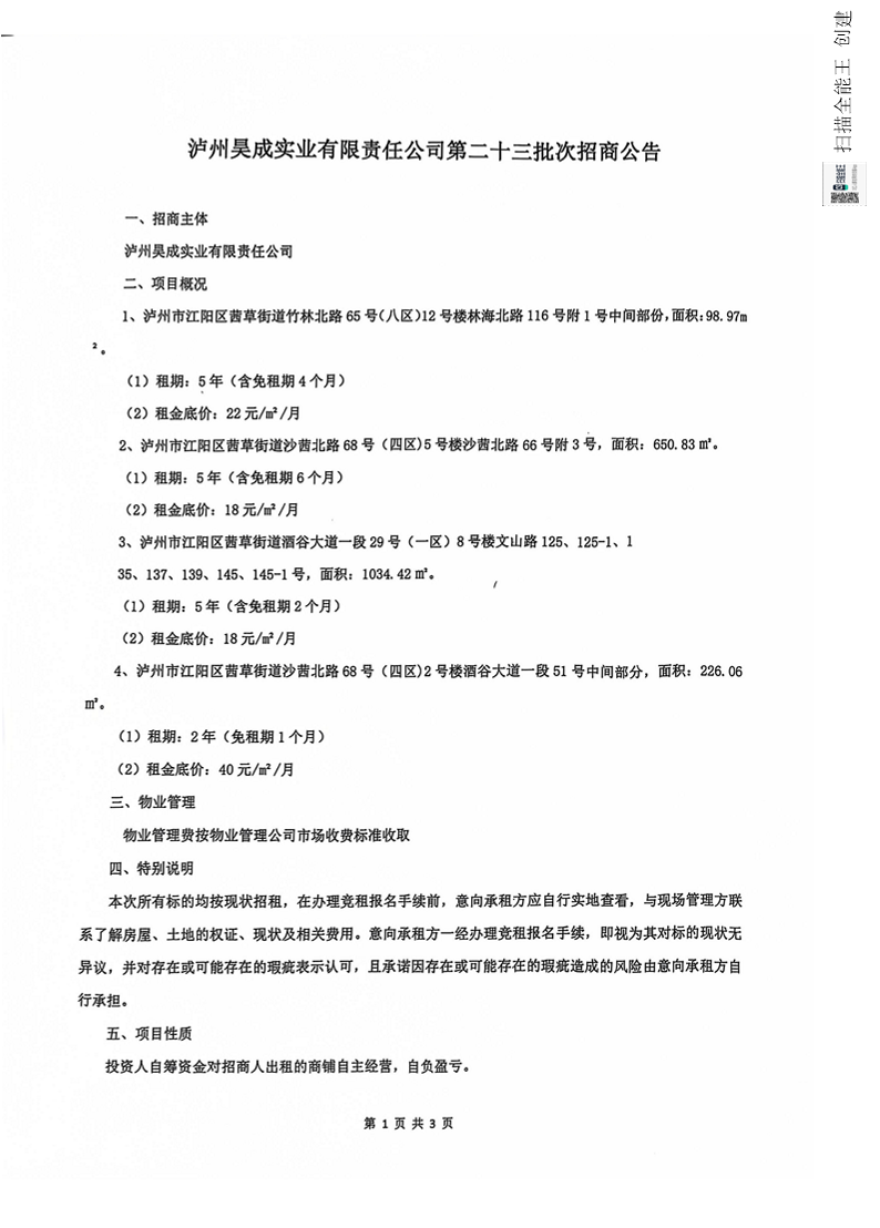 瀘州市昊成實業(yè)有限責任公司第二十三批次招商公告