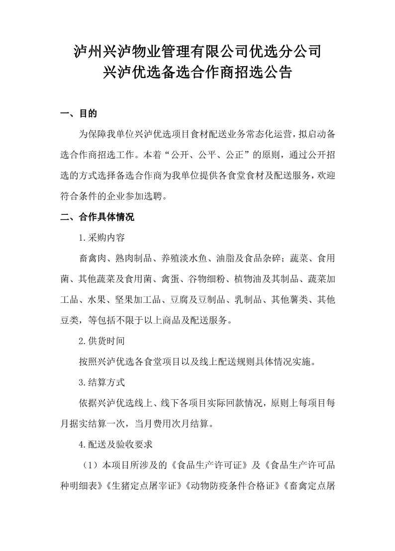 瀘州興瀘物業(yè)管理有限公司優(yōu)選分公司興瀘優(yōu)選備選合作商招選公告