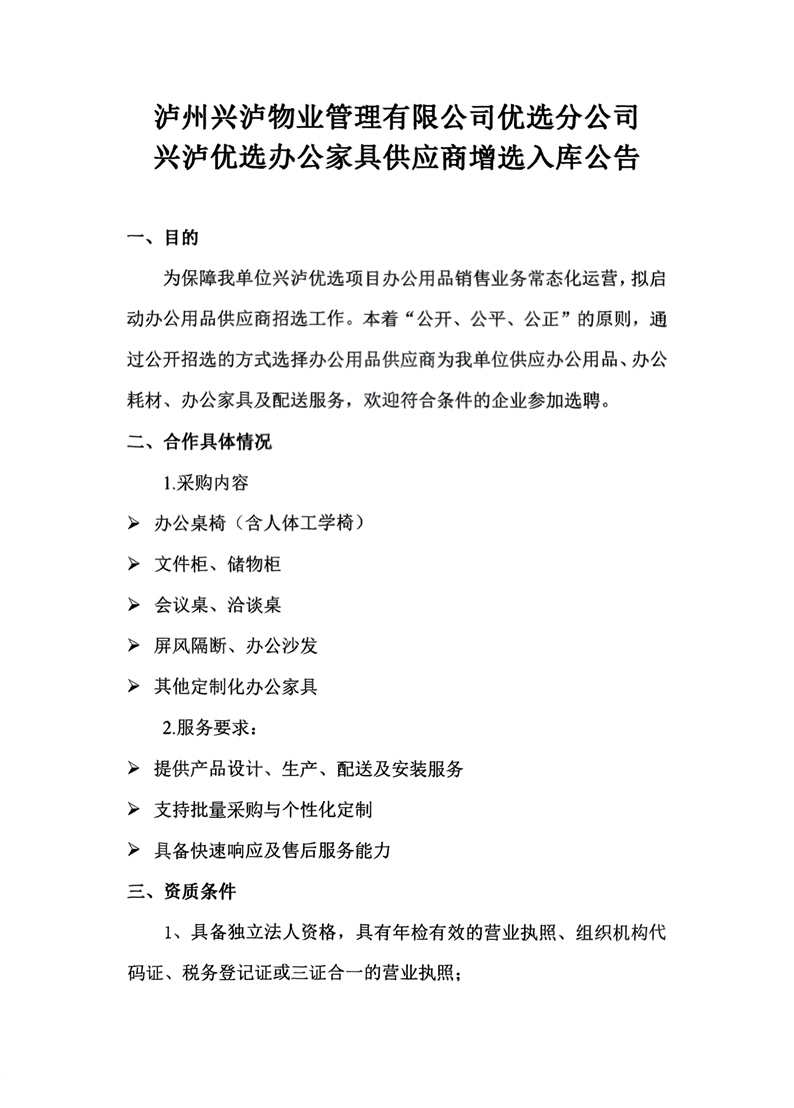 瀘州興瀘物業(yè)管理有限公司優(yōu)選分公司興瀘優(yōu)選辦公家具供應(yīng)商增選入庫公告 作者: 來源: 日期:2025-04-07 瀏覽次數(shù): 次 【字體:小 大】 【打印正文】