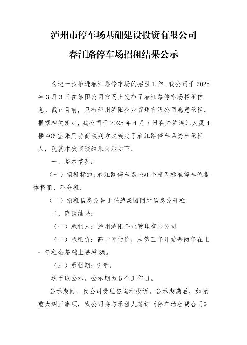 瀘州市停車場基礎(chǔ)建設(shè)投資有限公司春江路停車場招租結(jié)果公示