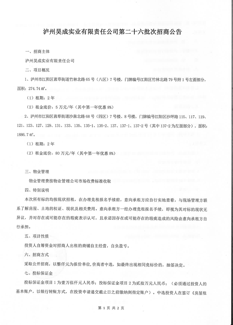 瀘州昊成實業(yè)有限責(zé)任公司第二十六批次招商公告