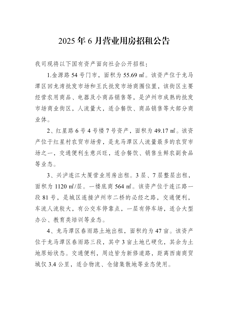 興瀘資產(chǎn)公司2025年6月?tīng)I(yíng)業(yè)用房招租公告
