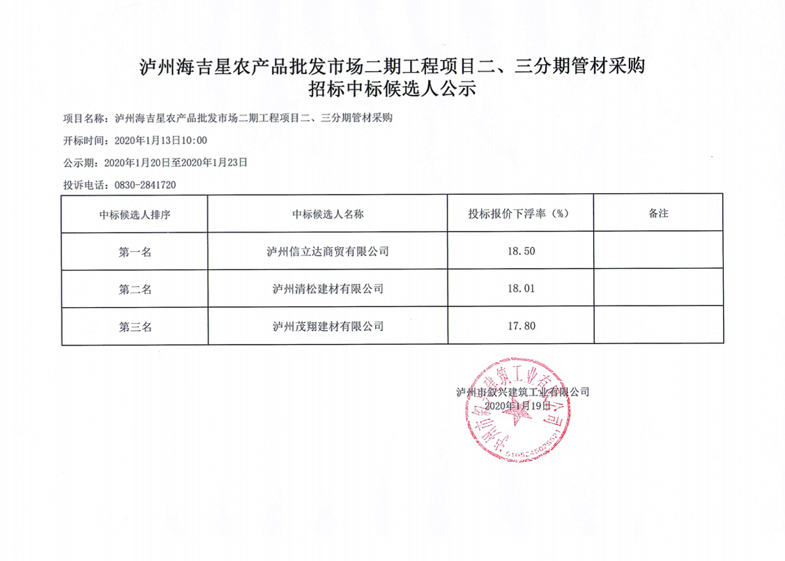 瀘州海吉星農(nóng)產(chǎn)品市場二期項目二三分期管材采購招標(biāo)中標(biāo)候選人公示 作者: 來源: 日期:2020-01-19 瀏覽次數(shù): 次 【字體:小 大】 【打印正文】
