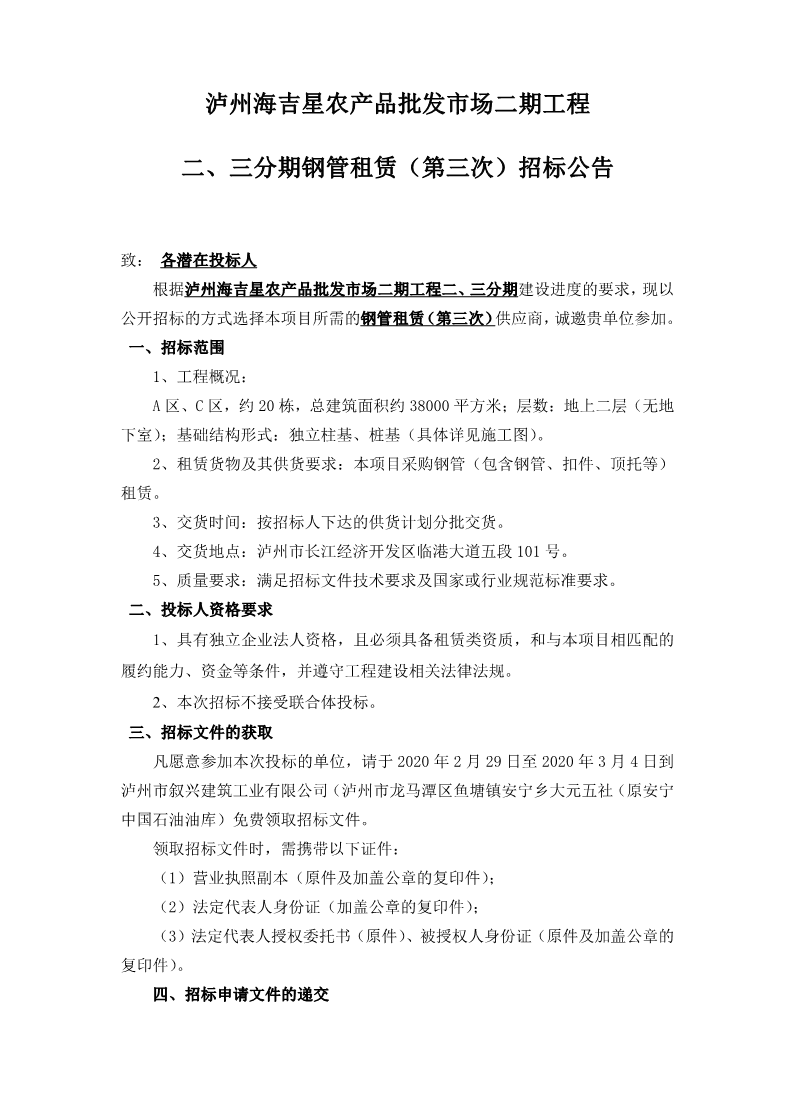瀘州海吉星農產品批發(fā)市場二期工程二三分期鋼管租賃(第三次)招標公告