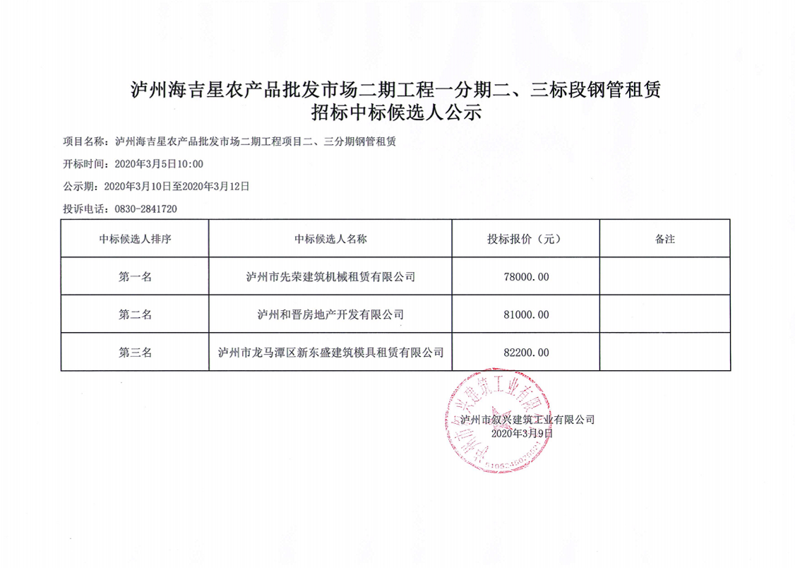 瀘州海吉星農(nóng)產(chǎn)品批發(fā)市場(chǎng)二期項(xiàng)目二、三標(biāo)段鋼管租賃招標(biāo)中標(biāo)候選人公示 作者: 來(lái)源: 日期:2020-03-09 瀏覽次數(shù): 次 【字體:小 大】 【打印正文】