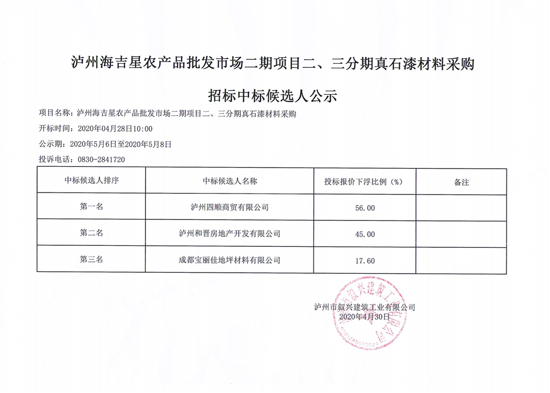 瀘州海吉星農(nóng)產(chǎn)品批發(fā)市場二期項目二三分期真石漆材料采購招標(biāo)中標(biāo)候選人公示 作者: 來源: 日期:2020-04-30 瀏覽次數(shù): 次 【字體:小 大】 【打印正文】